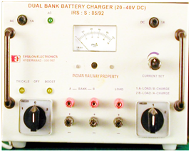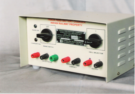 The Track Feed Battery Charger is used to charge 1 or 2 or 3 or 4 lead acid cells of 40 / 80 AH used in DC Track Circuits. 5 AMP. FOR CHARGING 40 AH BATTERY 10 AMP. FOR CHARGING 80 AH BATTERY It has a Double-Pole ON/OFF Rotary Switch, 110V AC Input Terminals and another Terminal for Earth are provided. DC Output Terminals are provided in the Front Panel. A Potential free contact is available to extend audiovisual alarm at remote place. A snap acting rotary (1 Pole / 4 Way) cell selector switch is provided for selecting 1, 2, 3 or 4 cells in four positions. |