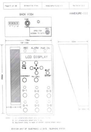 Centrallised Power Supply, eliminates power supplies at Gates thus enables Easy Maintenance. Privacy of conversation Cost Effective The Master Telephone Unit as per Rev.2 has Voice Logging Facility working on 24V/12V DC supply or 48VDC available from OFC Hut. • Time, Date, Year • Station ID • Calling / Called number in the ASM Cabin. • Called / Received Time and Duration. • Recording of events chronologically. Shall have provision to store minimum 200 hours of conversation on 8GB SSD. Built-in Speaker for listening recording of calls or live call monitoring. Automatic recording of all events occurring in the Master Telephone. Facility to replay last call by pressing one key. USB Cable Socket and interfacing to PC. Wave file auto copying facility. Application Software Installation CD provided. User interface key pad for assigning Station ID, correction of date / time etc. Well engineered dust free Master Unit. Current Consumption : Idle : 150 mA, During Speech : 250 mA, Ringing / Recording : 350 mA maximum.