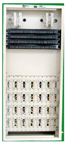 The V.F Transformer Bay manufactured by EPSILON is used in the communication line of Railway Electrification area to ensure systematic installation of V.F Transformers for use in various circuits. The V.F Transformer Bay houses up to 54 Transformers. All the Types of Transformers, namely V.F Tapping, Terminating and Signalling Transformers are housed in this Bay as per the requirements in the Circuit. Krone Type Connectors are provided for Wiring Incoming / Outgoing Cables. Link Panels are used for establishing Isolation / Connection on the lines in the Section. Integrated Line Protection Circuits are provided for each Quad. The Bay is constructed out of M.S. Steel Sheets complete with 5 Rows of Link Panels, Aluminum Sections for mounting the transformer and copper earthing strip. It is of sturdy construction and ensures compactness. The doors are made with reinforcement to avoid tilt. Grommets are provided for cable entries. Copper Strip is provided for earthing. Link Panels are as per ITI Specifications DE 224008/A. Links as per ITI Spec. No. BL/57279 are also supplied along with the Bay. Brackets are also provided for cable harnessing. |